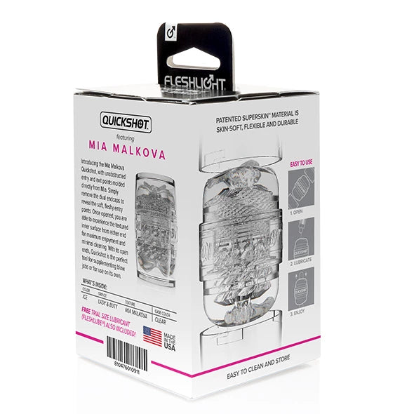 The Quickshot Mia Malkova has exit points molded from Mia's own vagina and butt. It can be used during oral play or for solo pleasure. DISCLAIMER: If your manhood is girthier than 5.5" or 14 cm, the Quickshot may not be the right fit for you. But don't worry, we have a variety of other full-size Fleshlight toys available! Unfortunately, we cannot accept returns on opened or used toys. However, men with larger girth can still enjoy the Quickshot sleeve without its casing, but that's up to you!